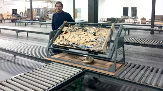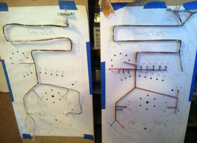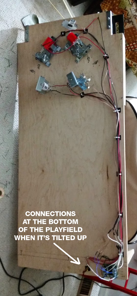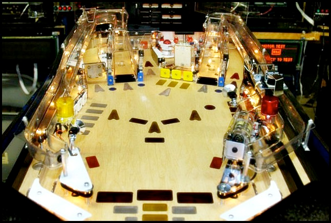 It is also possible to test play a layout while mounted to a rotisserie, so long as it has been leveled and there are rails around the perimeter to keep the ball from falling off. Sometimes the cabinet walls are used as walls for the playfield. Flipper buttons will also need to be temporarily wired up to actuate the flippers, and a bracket to mount a plunger if testing skill shots.