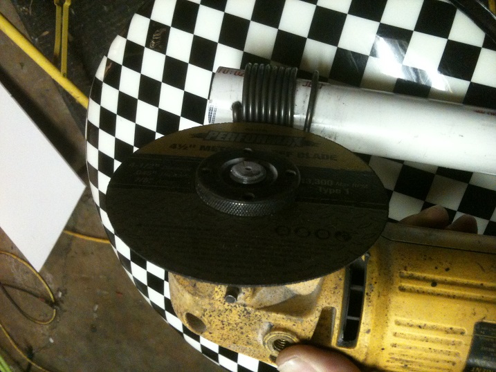 A simple way to get really nice and easy loops. Bolt cutters, shears, a hacksaw, or wire cutters capable of cutting the wire you are using can also be used as an alternative to the angle grinder, although the loop ends will not be as clean. Free the loop of wire by pulling down on it slightly and clipping off the bent leg that goes through the pipe. Clip or saw each ring off, using the edge of the last ring cut as a guide.