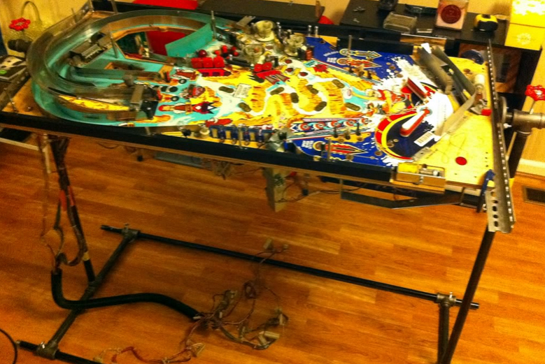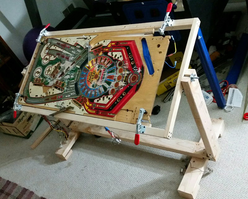 A hobbyist rotisserie doesn't need to be this elaborate. The most common rotisserie plan available online uses black gas pipes as the base, an angle plate for the playfield to rest on, and C-clamps to keep the playfield mounted:
