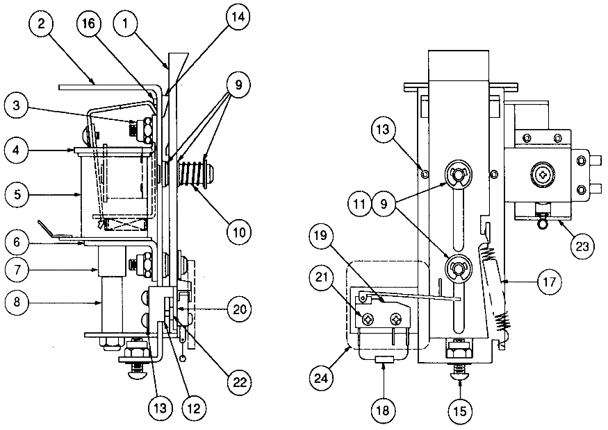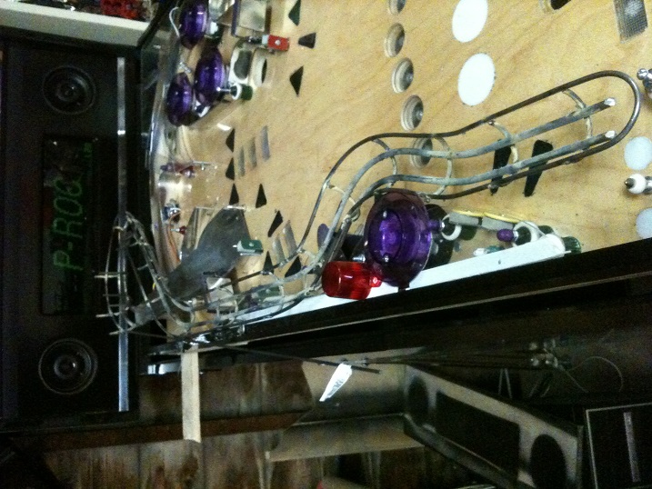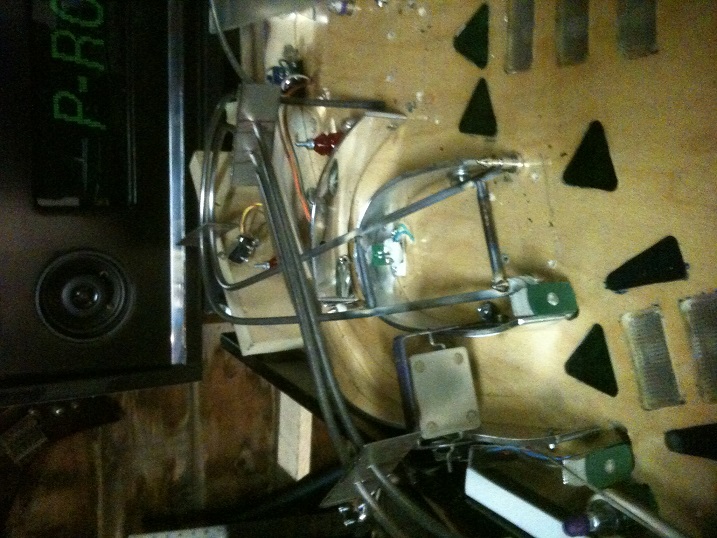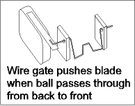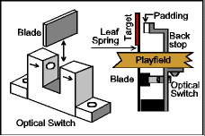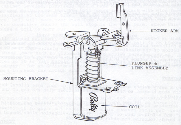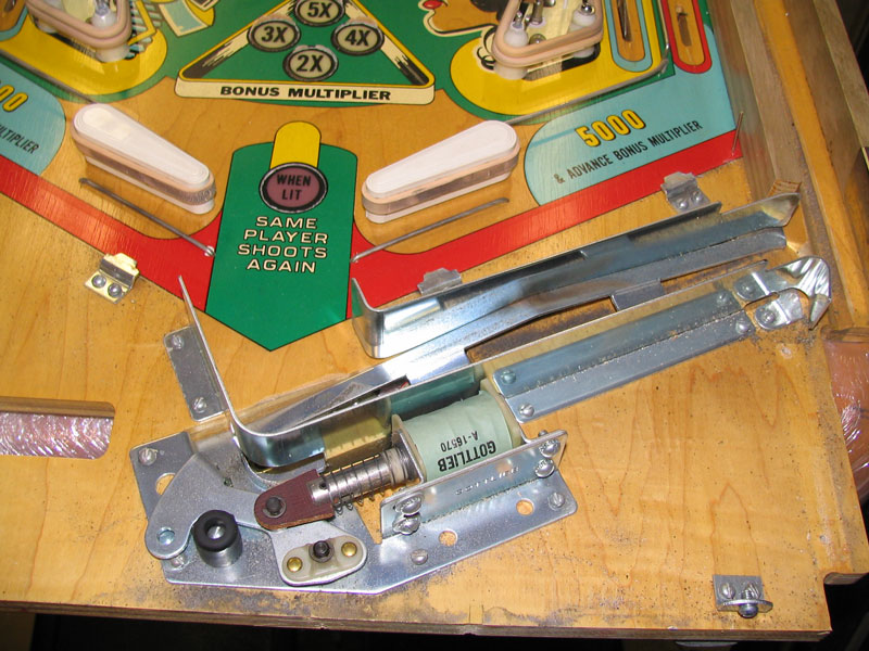 The mechanism for slightshots involves a coil under the playfield that fires when a ball hits the rubber ring of the slingshot, closes one of two switches to register the hit, then propelling the ball in the opposite direction.