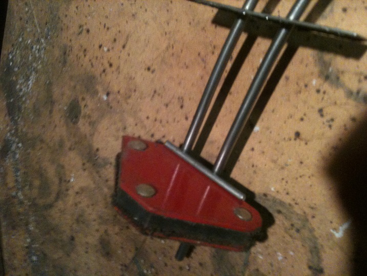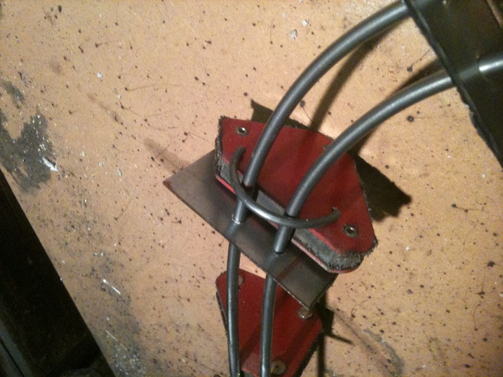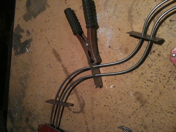 Clamp the ground for the welder to one of the jigs - you get a good, dependable circuit and it won't mess you up when you move it.