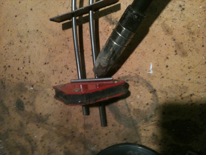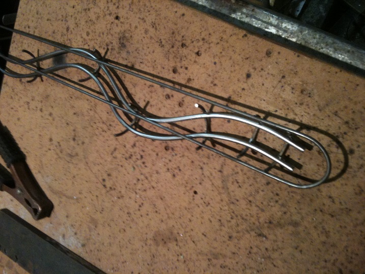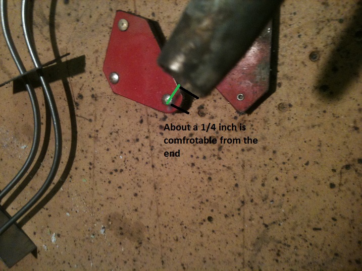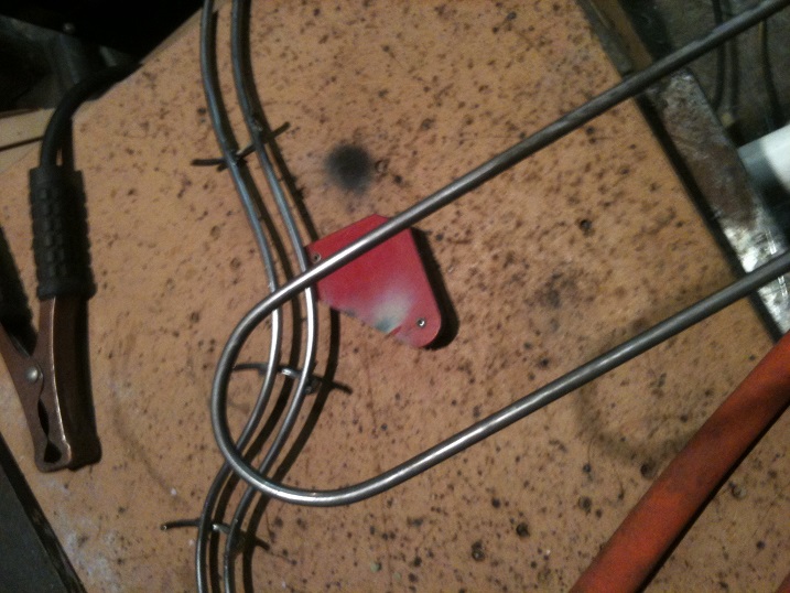 Cut a straight piece of stock, place it on the end of the rail and weld it up with a good tack. This will stop the wireform from twisting out of shape while putting the supports on. Use Welding Magnets (Usually about $3 each from most hardware stores) to hold the wire in position.